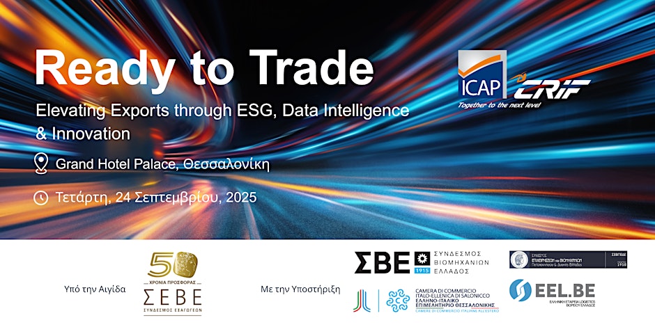 Η ICAP CRIF σας προσκαλεί στην εκδήλωση «Ready to Trade: Elevating Exports through ESG, Data Intelligence & Innovation», που θα πραγματοποιηθεί την Τετάρτη, 24 Σεπτεμβρίου 2025, στο Grand Hotel Palace, Θεσσαλονίκη.